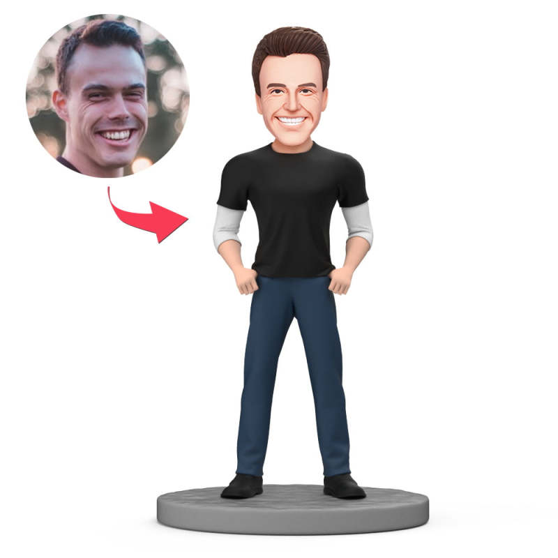 Homme Décontracté Portant Une Chemise Noire Et Un Jean Bobblehead Personnalisé Avec Texte Gravé Pour Papa