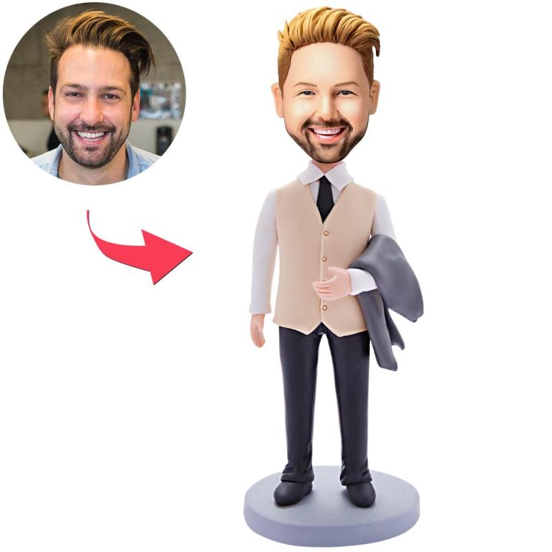 Homme d'affaires bobblehead personnalisé en tenue de soirée avec texte gravé