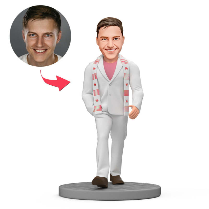 Bobbleheads Personnalisés Pour L'obtention Du Diplôme - Diplômé Masculin Avec Ruban Blanc
