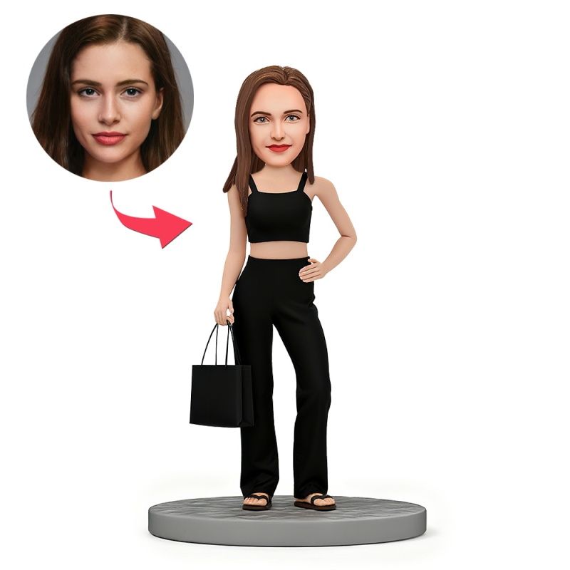 Femme Personnalisée En Costume Débardeur Noir Portant Un Sac À Main Bobbleheads Personnalisés Avec Cadeau Texte Gravé