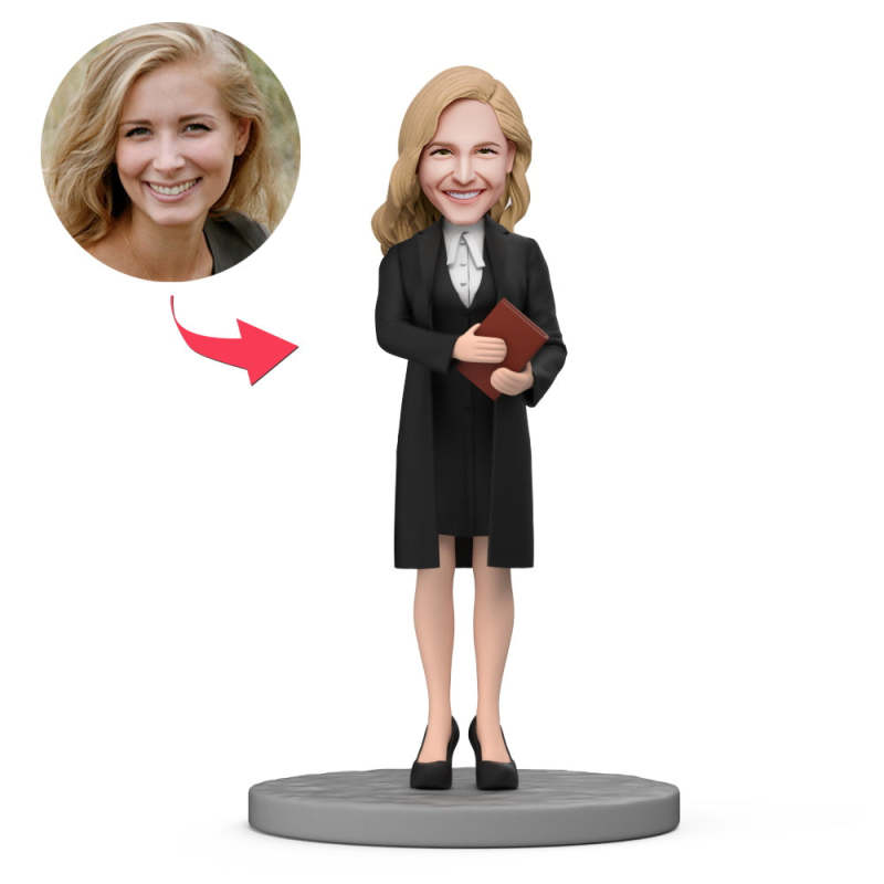 Une Avocate Porte Un Costume Noir Tient Un Livre À La Main Bobblehead Personnalisé Avec Texte Gravé