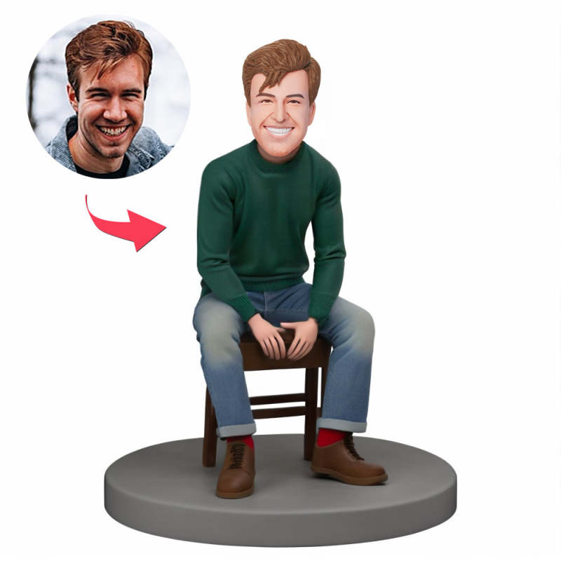 Cadeau Pour Lui Bobble Head Personnalisé Homme Portant Un Pull Vert Assis Sur Une Chaise