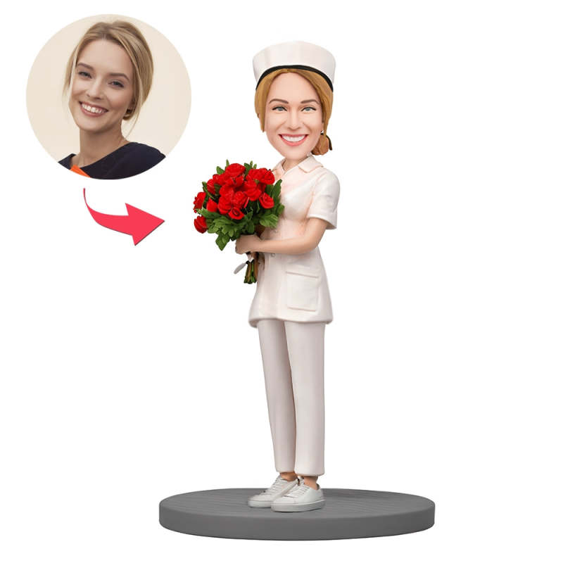 Cadeau Pour Infirmière Bobblehead Personnalisé Excellente Infirmière Tenant Des Fleurs