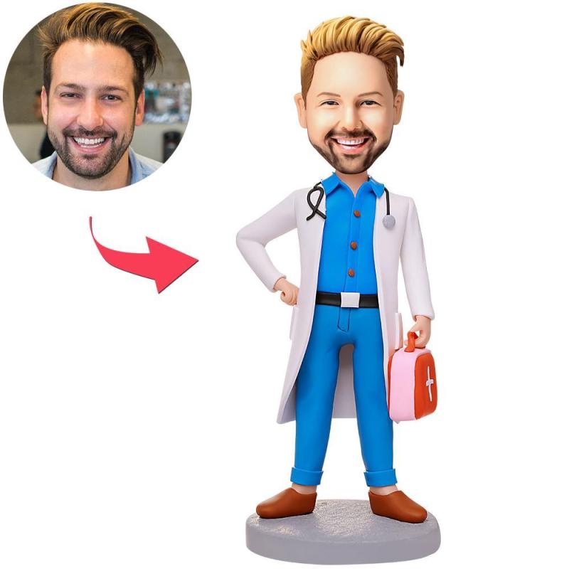 Médecin de sexe masculin portant une trousse de premiers soins Bobbleheads personnalisés avec texte gravé
