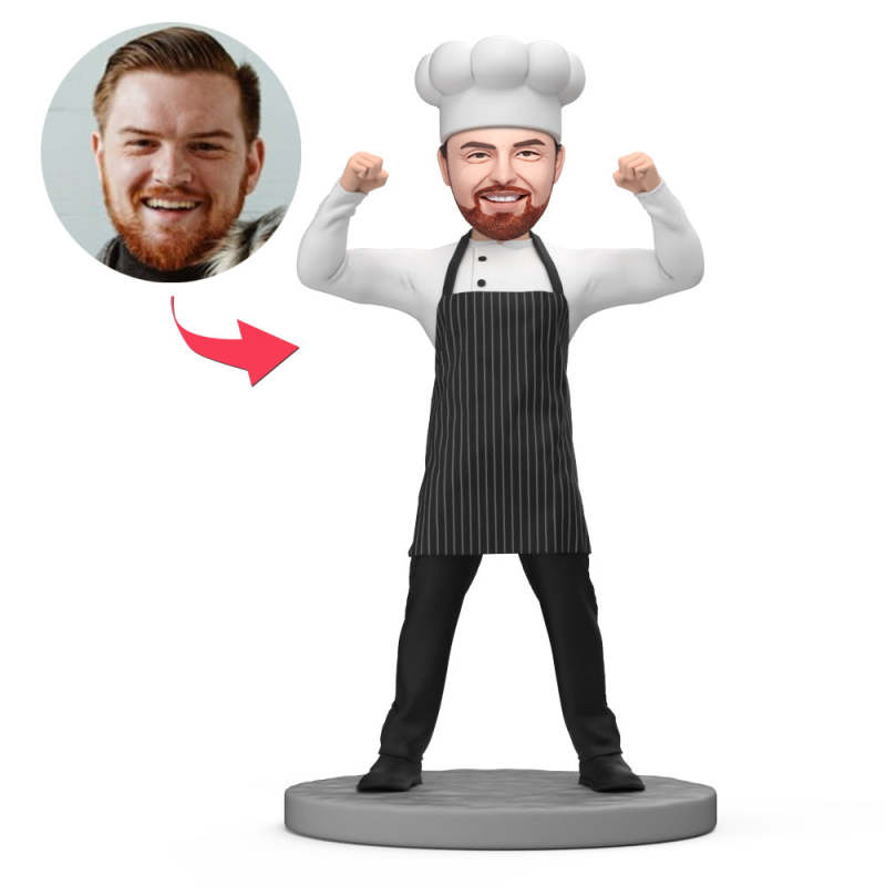Le Chef Puissant Masculin Porte Un Tablier Noir Bobblehead Personnalisé Avec Texte Gravé
